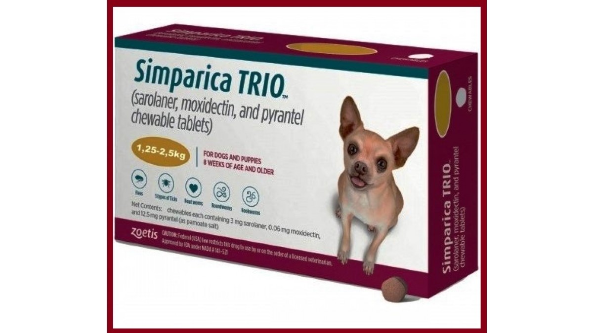 - Код товара: Simparica Trio 3mg Chewable Tablets for Dogs (1.25 - 2.5kg)